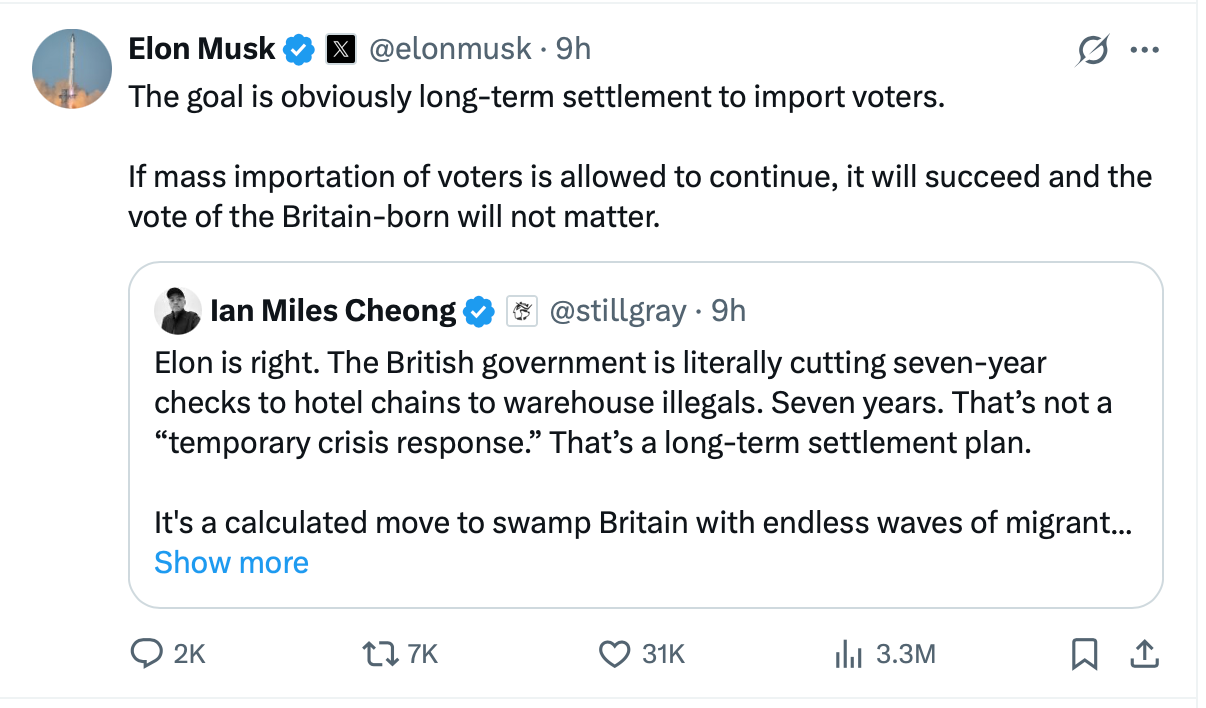 Elon Musk sharpened his criticism of Keir Starmer on X, accusing the UK government of orchestrating “long-term settlement to import voters.” In a pointed post on X, Musk wrote: “The goal is obviously long-term settlement to import voters. If mass importation of voters is allowed to continue, it will succeed and the vote of the Britain-born will not matter.”