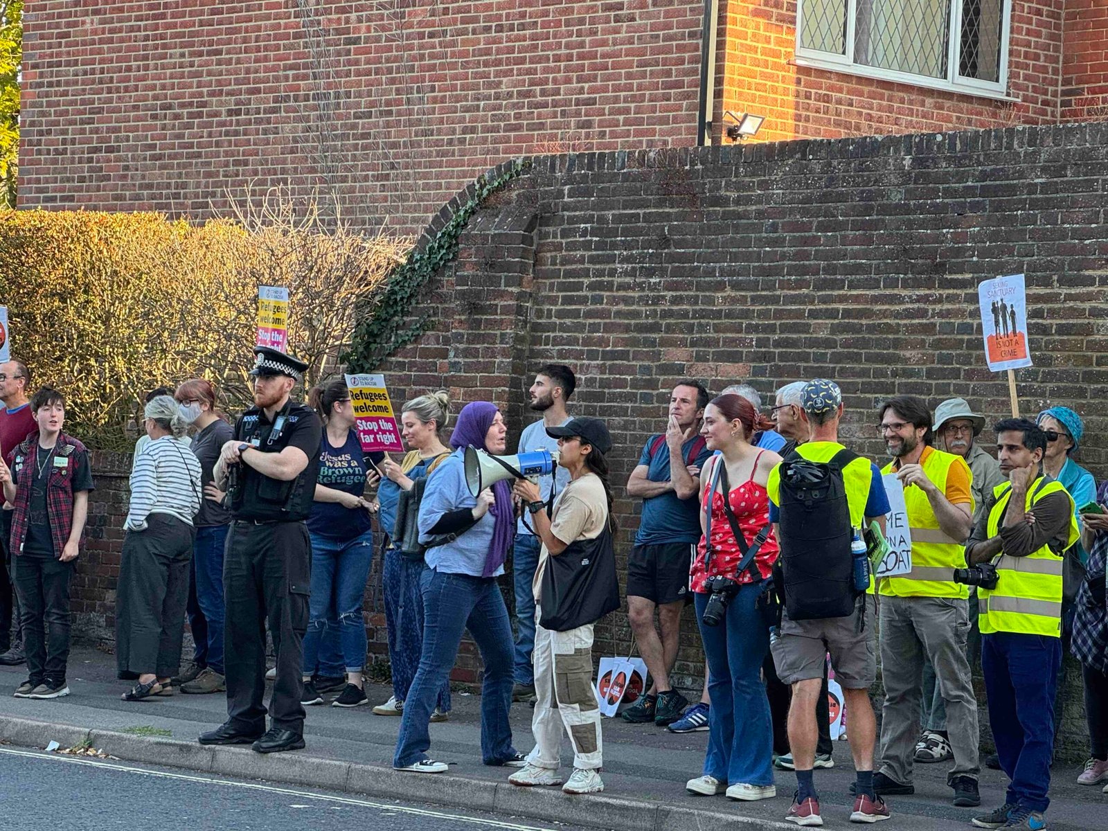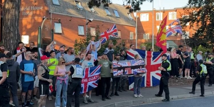 A crowd of several hundred anti-illegal immigration protestors assembled peacefully outside the Highfield Hotel in Southampton this Friday evening, voicing their frustration over what they see as the government’s failure to control Britain’s borders. The demonstration, which drew participants from across the region, remained calm and well-organised, with protestors carrying signs and chanting slogans but largely avoiding confrontation.