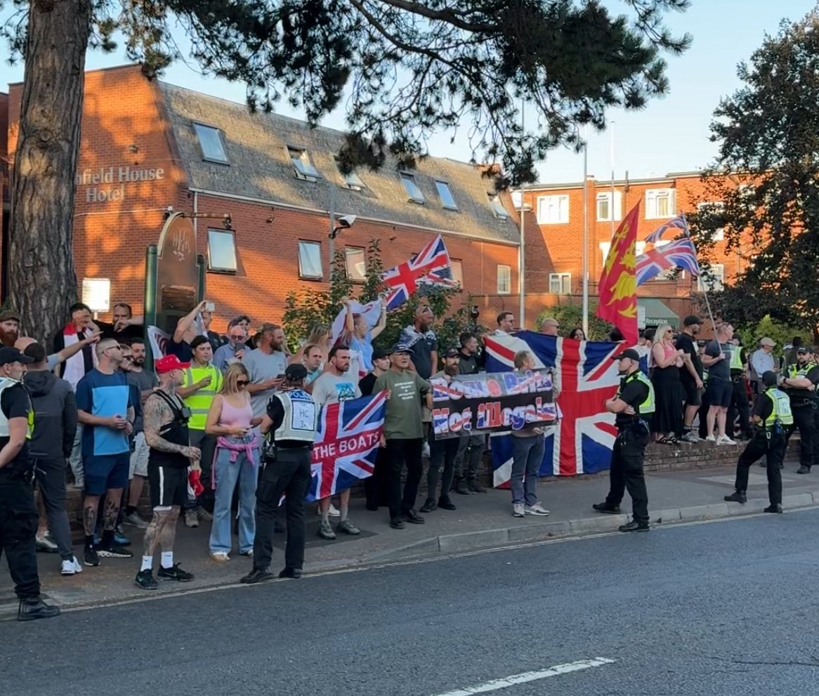 A crowd of several hundred anti-illegal immigration protestors assembled peacefully outside the Highfield Hotel in Southampton this Friday evening, voicing their frustration over what they see as the government’s failure to control Britain’s borders. The demonstration, which drew participants from across the region, remained calm and well-organised, with protestors carrying signs and chanting slogans but largely avoiding confrontation.