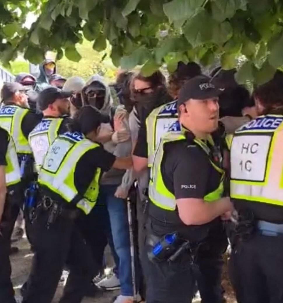 A tense stand-off unfolded outside the Highfield House Hotel in Southampton on Sunday, 17 August, as masked counter-protesters attempted to disrupt an anti-migrant hotel demonstration from setting up near the premises. They attempted to storm the organisers while they setup their stand and music system before the protest had even begun, but Hampshire Police were quick to intervene and use force to hold back the marauding masked hooligans.
