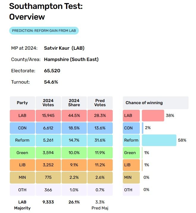 Polls released show a dramatic rise in support for Nigel Farage’s Reform UK party in Southampton, with the party overtaking both Labour and the Conservatives locally and even nationally. According to the latest projection from Electoral Calculus, both Southampton Itchen and Southampton Test, currently held by Labour MPs Satvir Kaur and Darren Puffy are predicted to flip to Reform UK if a general election were held today. Even more striking, the same model places Reform UK as the largest party in Parliament, potentially securing a majority government.